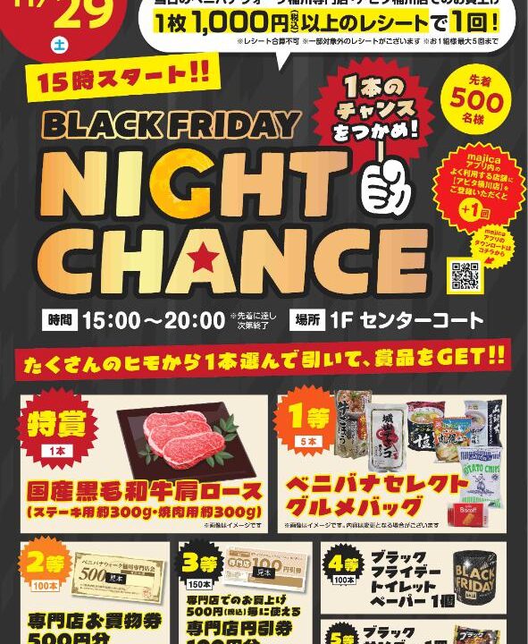 BLACK FRIDAY NIGHT CHANCE 開催!1,000円レシートで豪華景品が当たる!は11月29日の開催となります。