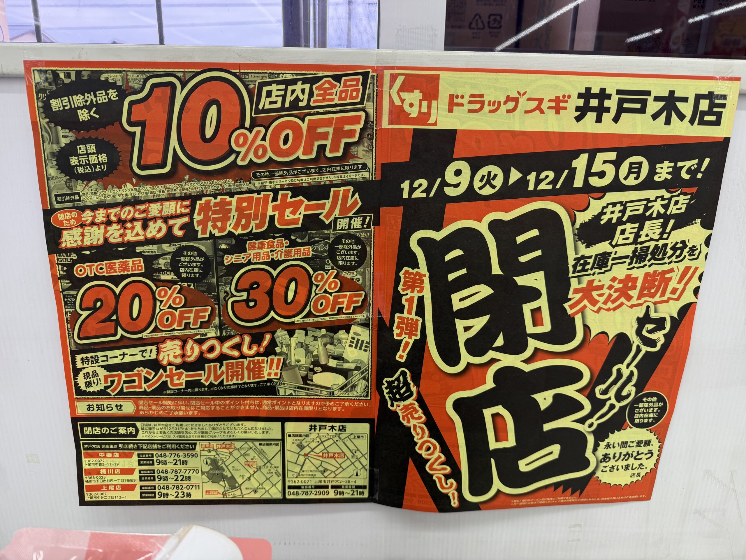 今回は、上尾市にある「ドラッグスギ 井戸木店」が閉店するとの情報をいただいたので共有します。