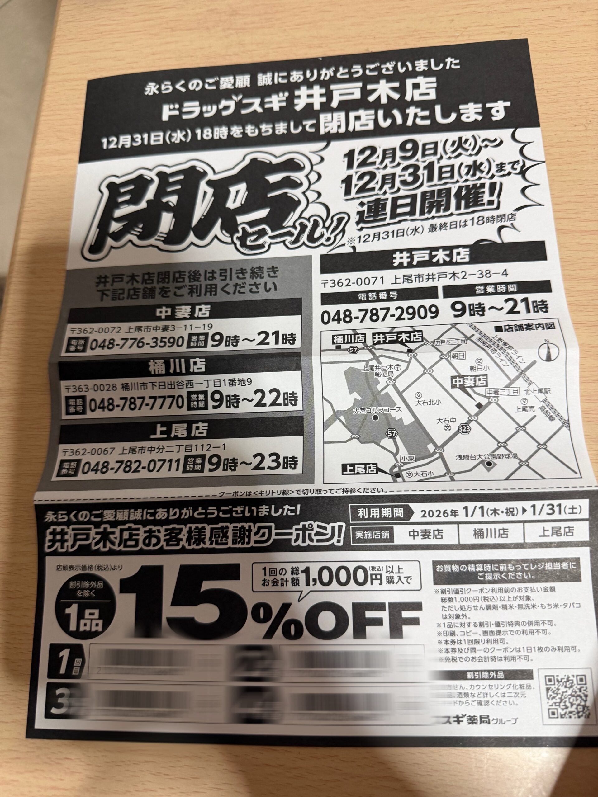 今回は、上尾市にある「ドラッグスギ 井戸木店」が閉店するとの情報をいただいたので共有します。