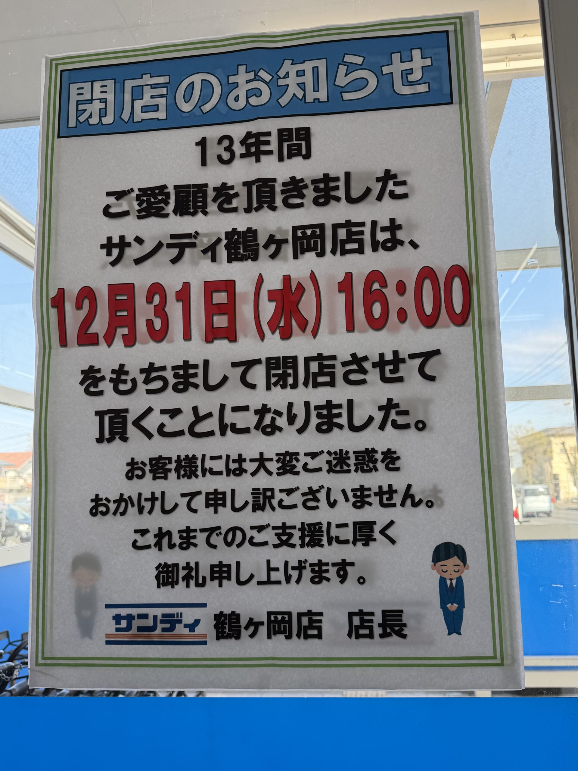 「サンディ 鶴ヶ岡店」は、2025年12月31日16時をもちまして閉店となります!