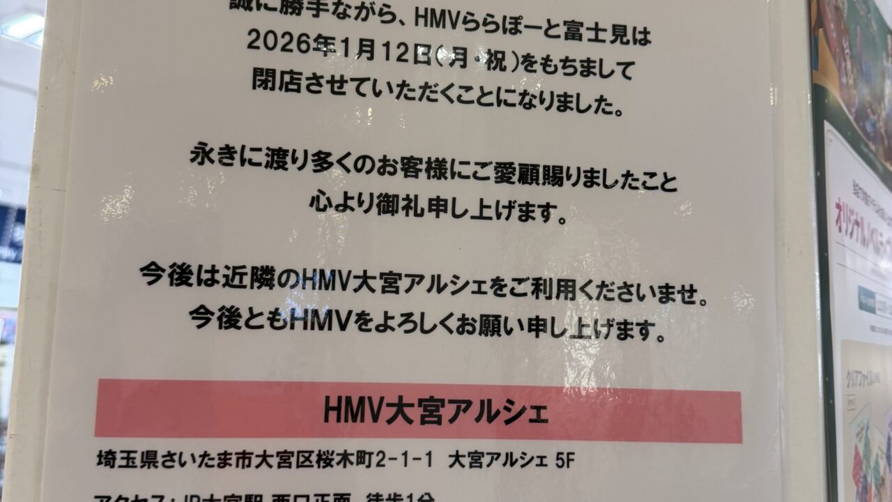 今回は、ららぽーと富士見の1階にある「HMV」が閉店するとの情報をいただいたので共有します。