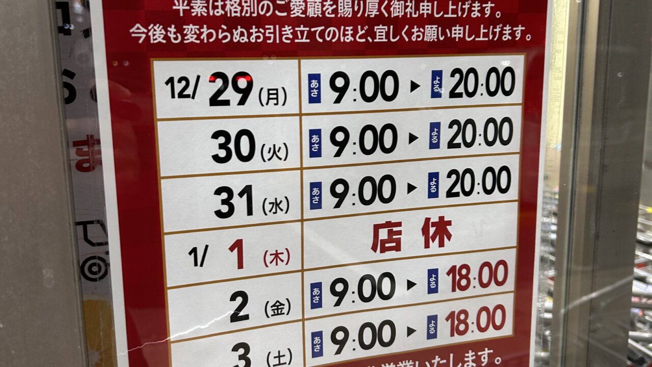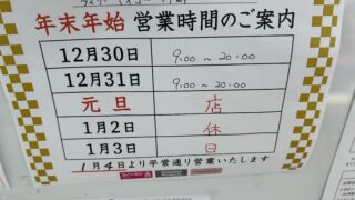 1月1日は休みで、2日と3日は時短営業(9時~18時)になりますのでお間違えのないように!!