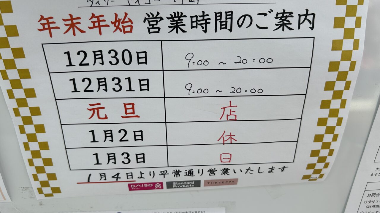 今回は川島町にある100円ショップの年末年始情報です。