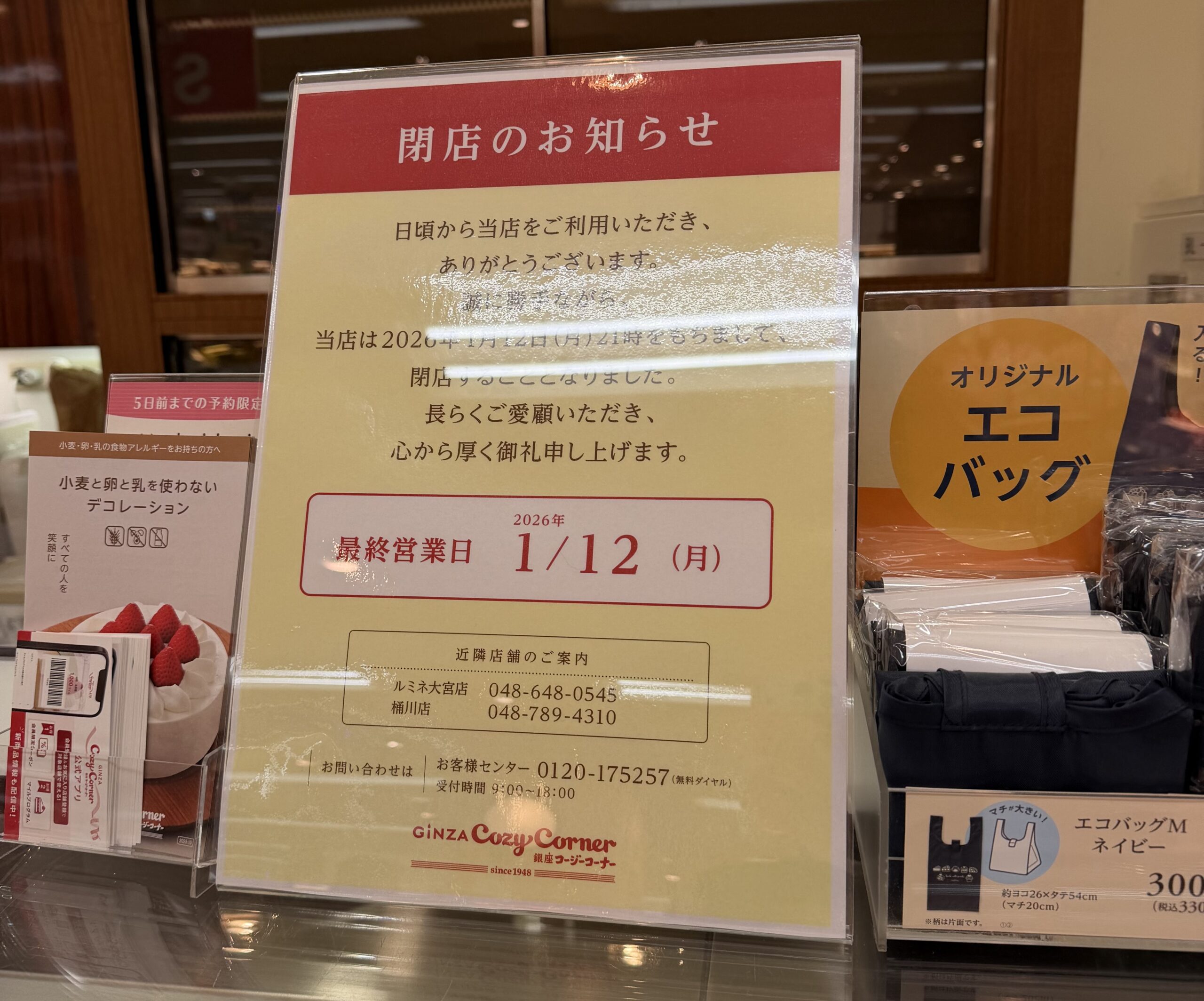 「銀座コージーコーナー イトーヨーカドー上尾駅前店」の閉店情報でした。