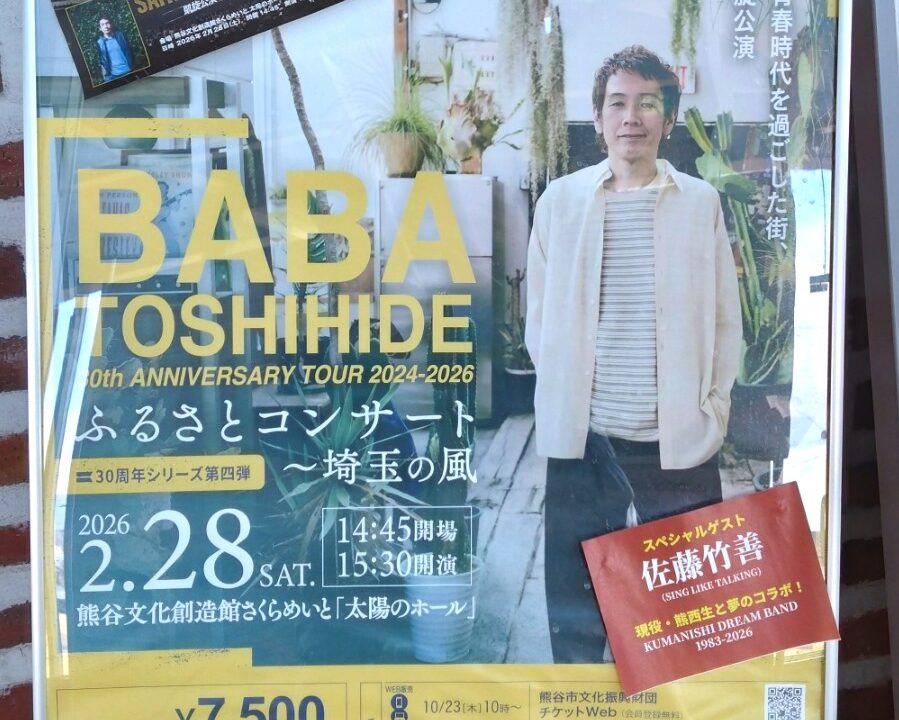 今回は、熊谷市出身のシンガーソングライター・馬場俊英さんの30周年記念ライブ「BABA TOSHIHIDE 30th ANNIVERSARY TOUR 2024-2026 30周年シリーズ第四弾『ふるさとコンサート〜 埼玉の風』」をご紹介します!
