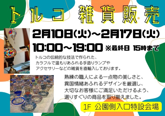 トルコ雑貨販売はエルミこうのすで2月10日(火)~2月17日(火)まで開催されます。