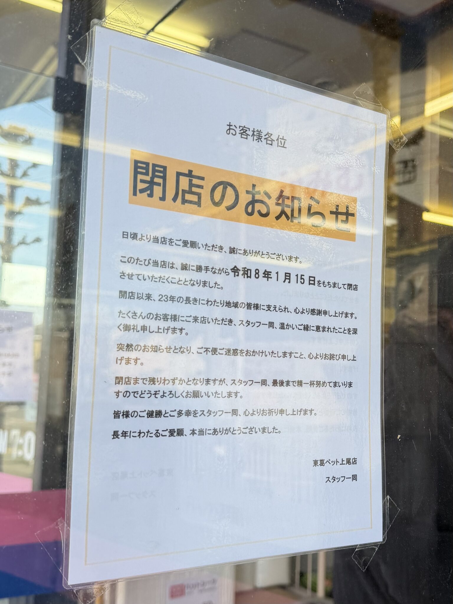 「ペットのデパート東葛 上尾店」が閉店すると以前お伝えしましたが、いよいよ明日が最終日となりますので再度アナウンスさせていただきます!