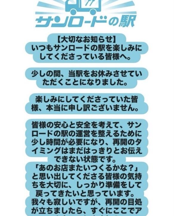 第2のきっちんかーの駅「サンロードの駅」1月18日にグランドオープンを予定していましたが、少しの間お休みすることになったようです。