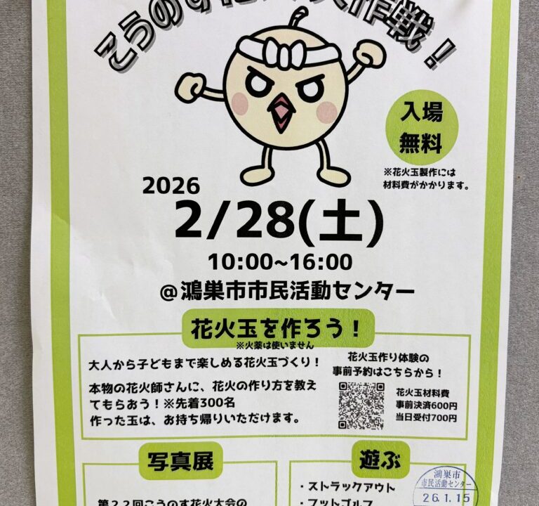 今回は鴻巣市で行われる「こうのす花火 大作戦!」の情報です。