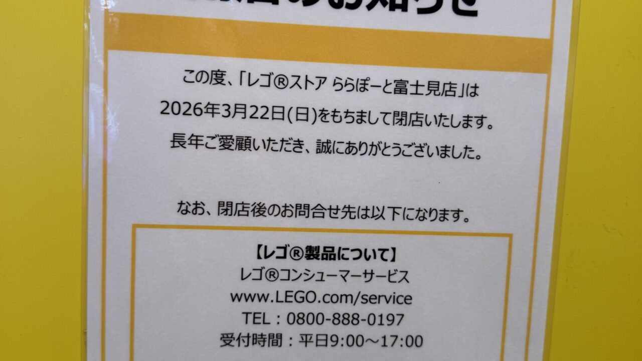 「レゴ®ストア ららぽーと富士見店」の閉店情報でした。