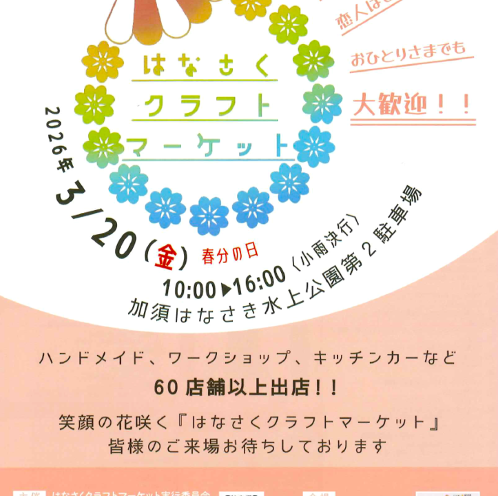 春分の日、3月20日(金・祝)に加須はなさき公園で「第6回 はなさくクラフトマーケット」が開催されます!