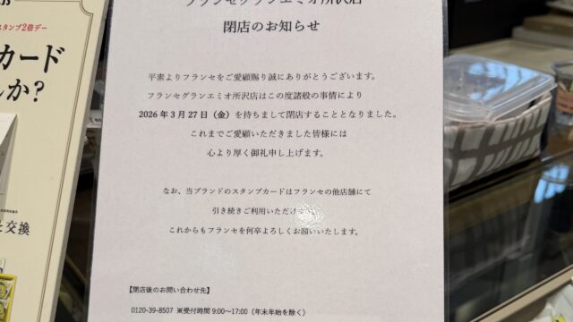 閉店情報 【所沢市】「フランセ グランエミオ所沢店」が3月27日をもって閉店となる事がわかりました!! 2026年3月1日 埼玉マガジン http://app.saitama-city-marathon.jp/wp-content/uploads/2025/11/埼玉マガジン-6.png アプリ版 埼玉マガジン